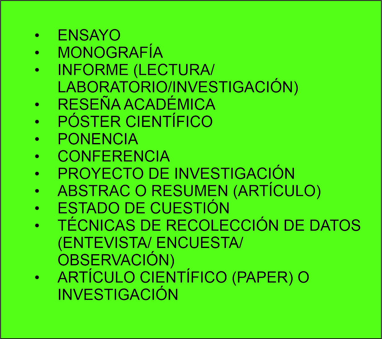 Algunos ejemplos de estos géneros específicos son: el artículo de revista especializada, el proyecto investigación, la ponencia de congreso, la reseña bibliográfica, la tesis, la monografía, la definición, la nota de enciclopedia, el informe de experimentos, la biografía (en este espacio la vamos a considerar como un discurso separado y no un discurso académico), el relato histórico, entre otros.